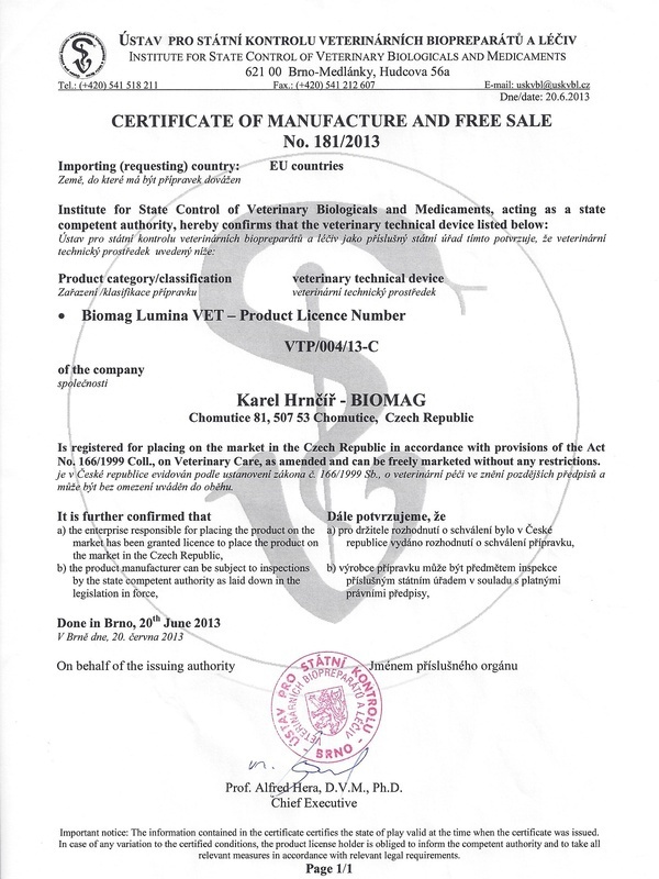 A Biomag állatgyógyászati eszközök fejlesztésére és gyártására szóló tanúsítvánnyal is rendelkezik.