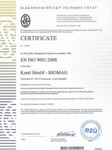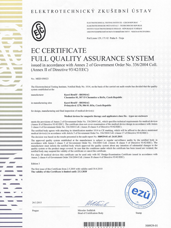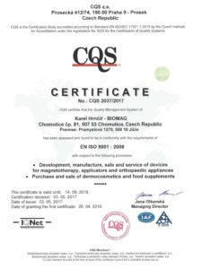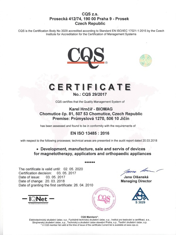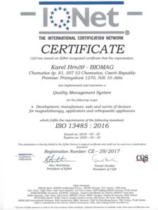 A Biomag készülékek gyártója az ISO 9001 és a z ISO 13485 szabványrendszerek alkalmazásával, és a szabványoknak való megfelelőséggel magas szinten végzi az orvostechnikai eszközök fejlesztését és gyártását.